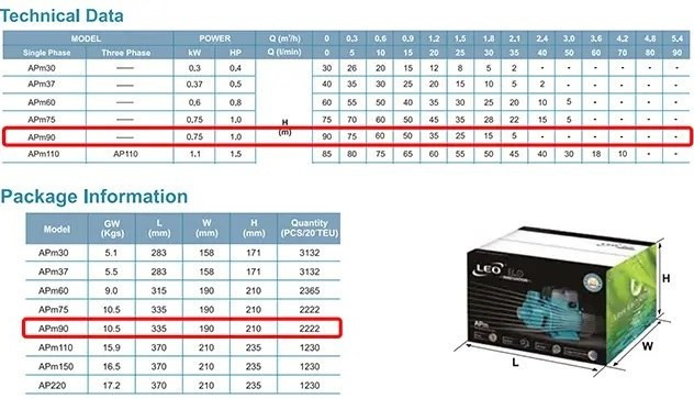 با مقایسه پمپ آب 1 اسب محیطی لئو مدل APm75 و APm90 میتوان دریافت این دو پمپ تنها از دیدگاه قطر خروجی با یکدیگر متفاوت هستند که این تفاوت سبب شده است هد بیشینه پمپ APm75 معادل 75 متر و بیشینه هد پمپ APm90 معادل 90 متر شود. اگر چه هد بیشینه پمپ APm90 از رقیب خود بیشتر است، بیشینه دبی پمپ APm75 حدود 15 لیتر بر دقیقه از APm90 بیشتر است. براساس لوله کشیهای مرسوم در ایران معمولا از APm75 یه عنوان پمپ آب خانگی استفاده میشود. توصیه میشوند برای قطع وصل پمپ APm90 به دلیل فشار زیاد از ترکیب کلید اتوماتیک، منبع انبساط، پنج راهی برنجی و گیج فشار به جای ست کنترل استفاده شود. در جدول و شکل بعد مشخصات آبدهی بر حسب هد و همچنین ابعاد پمپ APm90 و سایر پمپهای محیطی لئو گزارش شده است.